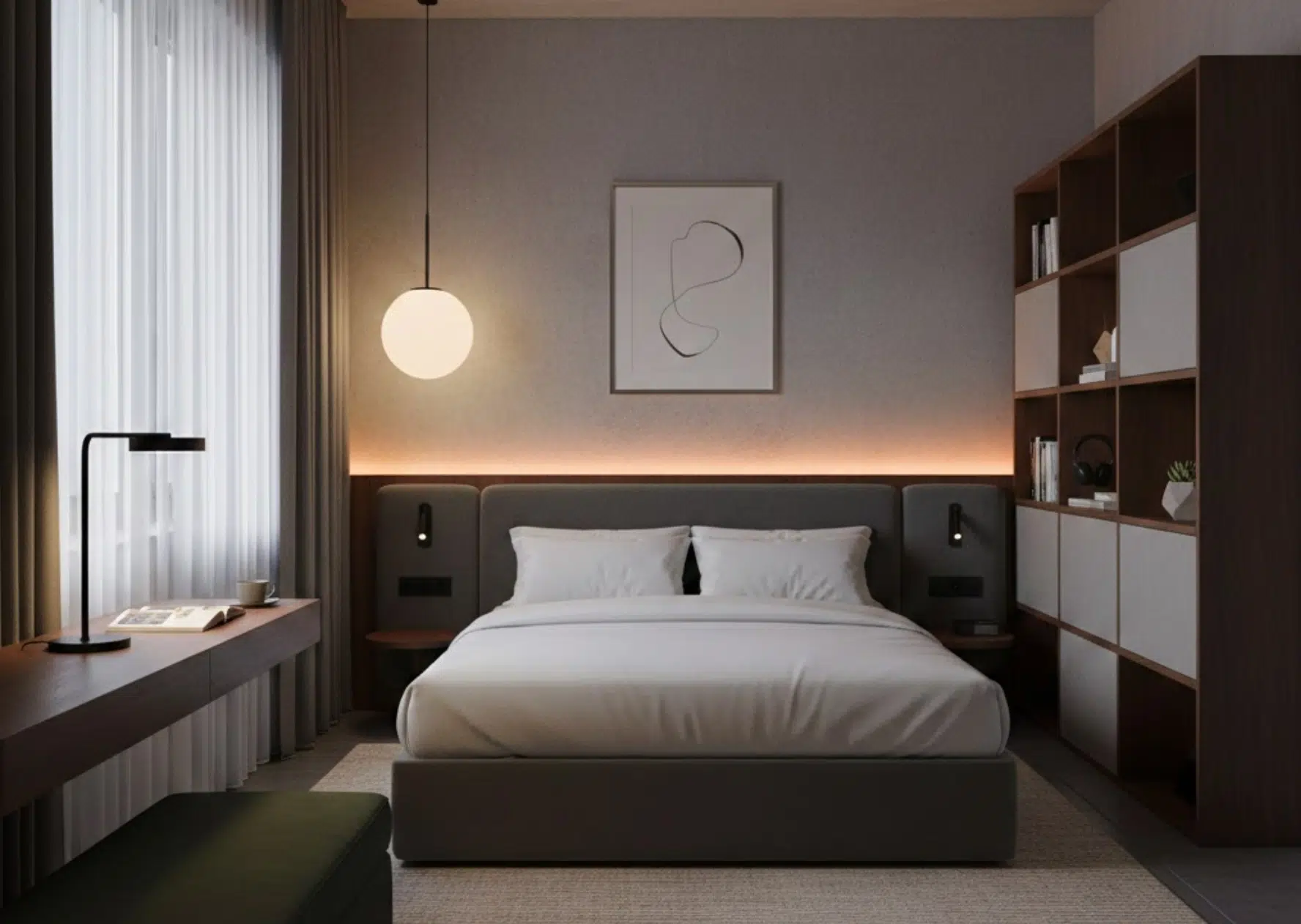 Éclairage artificiel : suspension centrale diffusant une lumière homogène, complétée par des lampes de chevet pour l’éclairage d’appoint
