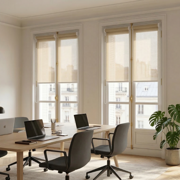 Le store enrouleur screen est la solution la plus répandue dans les bureaux. Discret et efficace, il s’adapte facilement aux fenêtres standard comme aux grandes baies vitrées.