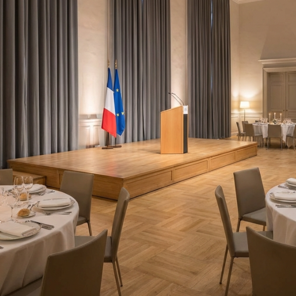 Les salles de mariage ou de réception doivent refléter une image officielle et accueillante. Les rideaux occultants ignifugés ou rideaux en velours non feu M1 sont particulièrement adaptés.
