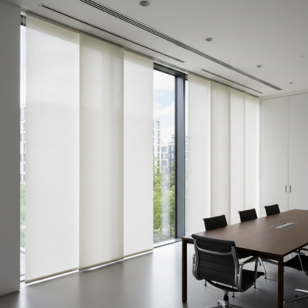 Les panneaux japonais M1 constituent une solution moderne pour les grandes vitrines ou baies coulissantes. Leur esthétique épurée s’intègre parfaitement aux bâtiments administratifs récents.