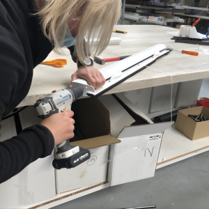 Les composants sont ensuite assemblés selon les mesures indiquées. Les poignées sont positionnées, le cordon de tirage installé pour contrôler la remontée de la toile, et le joint brosse placé sur la partie basse. Des caches latéraux viennent renforcer l’ensemble. L’assemblage est réalisé manuellement par nos équipes pour garantir fiabilité et précision.