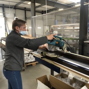 Les coulisses en aluminium sont découpées sur-mesure, puis percées selon un calcul automatique pour simplifier la pose. Des caches sont ajoutés aux extrémités, et une pastille rouge est placée sur la coulisse droite pour en indiquer le sens. Ces finitions facilitent l’installation.