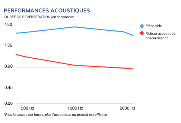 La courbe rouge, représentant la pièce équipée d’un rideau acoustique obscurcissant, montre une durée de réverbération nettement inférieure à celle d’une pièce non équipée. Plus la courbe est basse, plus l’absorption sonore est efficace.
